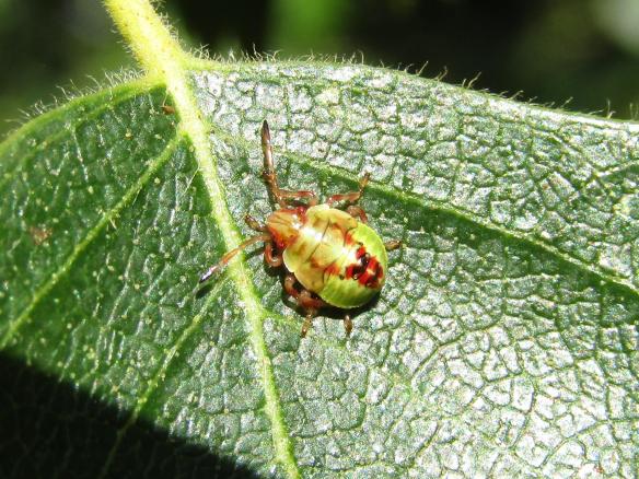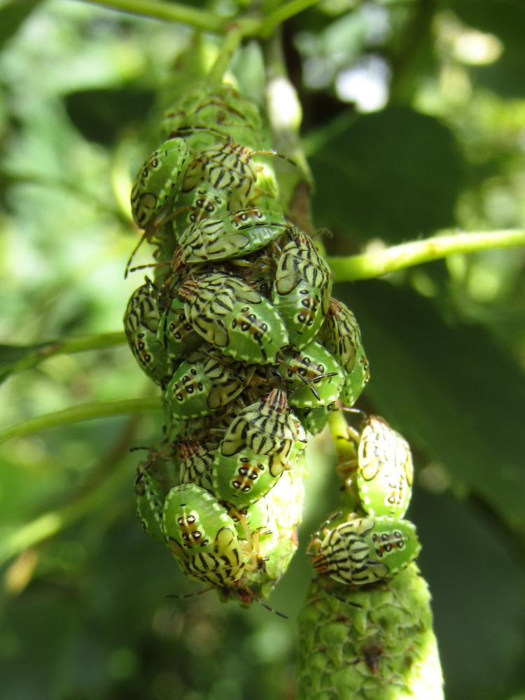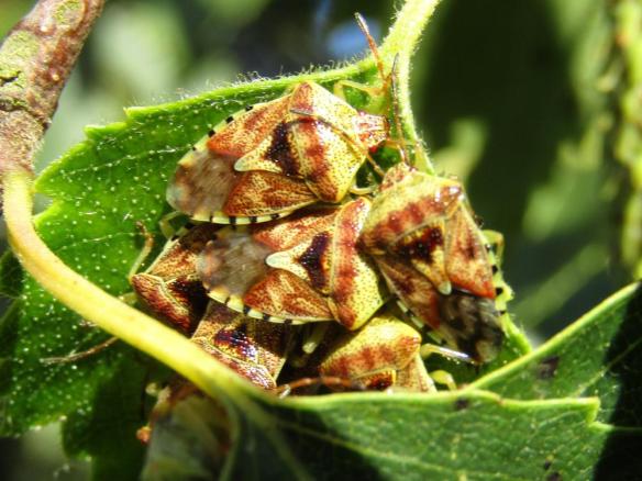 I have been keeping an eye on the birches where I first spotted the second instar nymphs and have managed to get a photo of final instar nymphs a week ago and today a number of adults. It seems that the adults photo is a little special as a couple of experienced recorders of shieldbugs have not seen adults crowded together thus on a leaf. I have only found one other similar photo on the internet so it would seem that not many people get to see this as the adults split up quickly it would seem and I am rather privileged to be one of those.