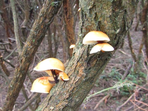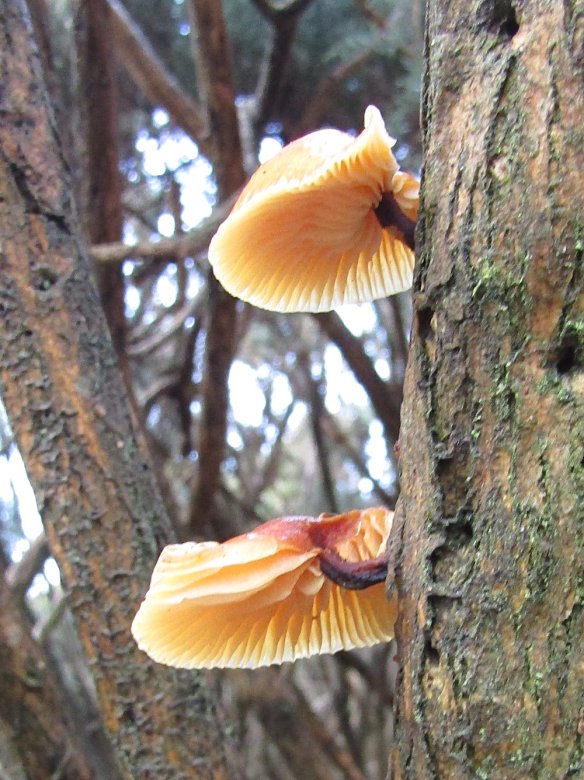 Warren Glen is a challenge to walk as are most places at the moment, so I was pleased to find these fungi on the western side where there is a small patch of burnt gorse on Monday. Velvet shank, or Flammulina velutipes, can be found in late autumn through to spring and is said to favour dead gorse and elm (Marcel Bon). Fortunately this seems to be one of the few species of fungi that one can identify with some certainty without resorting to spore prints and a microscope. I particularly like the three in the hollow of the gorse stem.