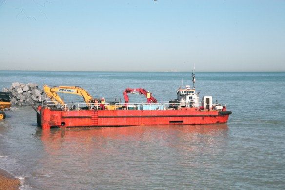 Having checked the tides I made my way up to the cliff path east of the village to watch the smaller barge the Charlie Rock towed by the Afon Goch come in and was surprised to see some sort of landing craft leaving the beach having dropped off a dump truck. I had assumed that the heavy plant that was on the beach at Pett Level would be tracked round at low tide, so I rushed round to Cliff Way to have a better view when it returned with it’s next load.