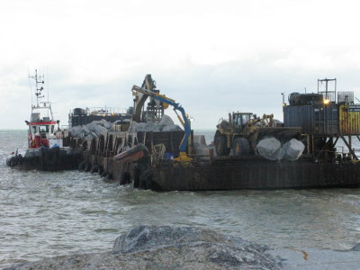 The final stage of the coastal protection berm at Fairlight Cove started recently. A large barge the Stema Barge II is moored offshore that is stated to be capable of carrying 21,000 tonnes of Larvikite an igneous rock similar to granite that comes from Norway.