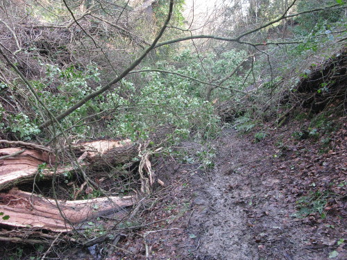 Coming up the Dripping Well path today I found that it is again blocked by a fallen tree. It is quite spectacularly split from a good way up the trunk as can be seen in this photo.