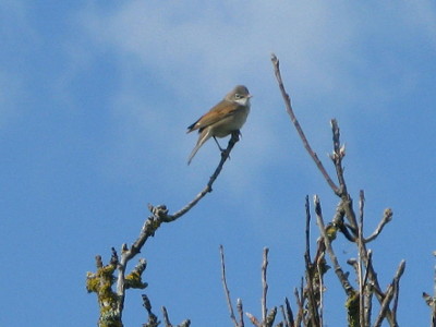 Yesterday I saw my first Whitethroat of the year, which is just about the right time. Many of these warblers will be arriving now having flown all the way from West Africa. The greyish head and white eye ring of this one suggests a male. The “white throat” from which it gets its name is also clearly visible.