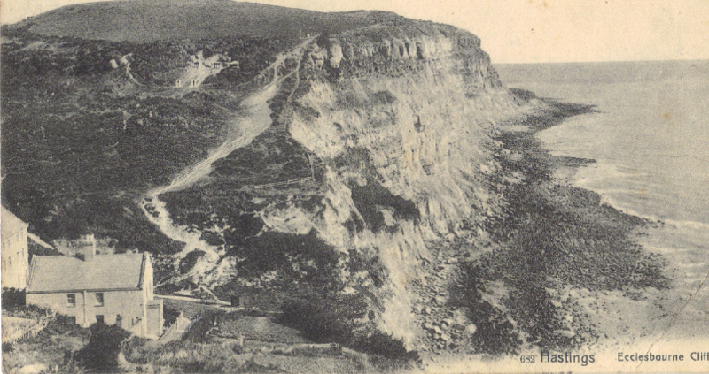 This has to be one of the earliest photographic postcards of Ecclesbourne Glen, showing the Coastguard Cottages as in it can be seen the rifle range targets and close inspection reveals the flagpole at the top of the footpath on the eastern side of the glen. There was also another flagpole on the East Hill near the 600yd firing position. Presumably these both carried flags when firing was in progress. Note also how much land there is between the closest cottage and the cliff edge, similar postcards show less than half that. Present day the edge is roughly between the 2 buildings.