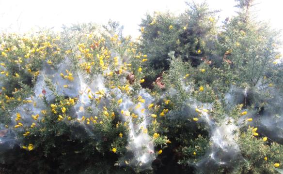 Ghostly goings on in the Quarry? Well actually no. These webs are created by Tetranycus lintearius the Gorse Spider Mite. The adults are half a millimetre long and bright red. A native to Europe, it has been introduced to other countries as a biological control measure, although it does not actually kill gorse it can reduce flowering and stunt the development of branches. The mites pierce the tissues of the plant whilst feeding.
