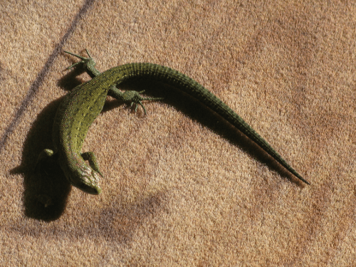 Edit – This common or viparous lizard is a good example of the variation in colour they exhibit. This green colour is not uncommon and results in many people mistakenly identifying them as sand lizards. However sand lizards are larger, have a differently shaped head and the green is much more vivid.